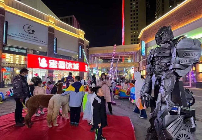 大家可以在金街与可爱的羊驼亲密的互动,还可以和威震天唠唠嗑,品尝一下东门酸辣粉提供的元旦免费酸辣粉,感受一下现场动感音乐的互动。