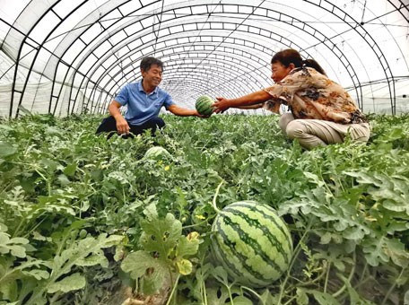 “俺村和定陶区南王店镇就隔着一条东鱼河,历来就有种植西瓜的传统,尝尝俺村的西瓜,味道不比外边的差。”今年55岁的江广轮种植了4个西瓜大棚,种出的西瓜甜度高、瓜味浓,亩收益1万元左右,销路一直不错,像这样的西瓜大棚,江海村有230多个。