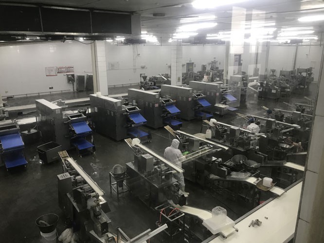 来到生产区,车间内正在检修,员工将包汤圆的机器擦拭干净放进仓库,搬出水饺混沌机。在生产车间,马青峰从对辊到机械手,再介绍每台价值60万新购机器;按顺序介绍面房、做馅的大料间,成型间,混沌、水饺料包、粉包车间,到包装机、封箱、称重仪。特别是传送链、一小时能生产4吨产品的螺旋速冻库,20分钟内将中心冷冻到零下24度,有四组16个螺杆机,每个有650米传送链、重55吨,换一条链45万。