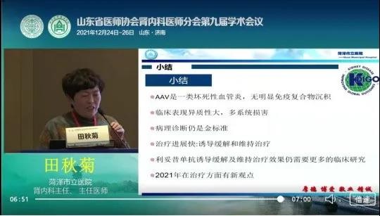 山东省医师协会肾内科医师分会第九届学术会议,于2021年12月24日-26日在山东济南圆满结束,菏泽市立医院泌尿内科主任田秋菊应邀参加,并作学术报告,获得了省内外专家高度肯定和一致好评。此次大会由山东省医师协会/山东省医师协会肾内医师分会主办,是肾脏病方面规格和级别最高的学术会议,来自肾内科领域线下、线上专家学者、同道等(共3000余人)进行了深入的研讨交流。会议邀请国内知名专家,围绕肾脏疾病新技术、新理论进行学术讲座,聚焦相关方向的热点和难点问题进行讨论、交流,及时传递最新临床和学术进展。