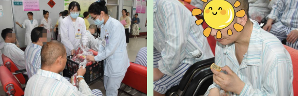 随后,现场工作人员一起将美味的礼品发放到在场每一位病友手中,大家心中既开心又感动。有的病友说:“我一直没想过能在医院里,这么快乐地度过中秋节”,还有的病友说:“好多年没有这么热闹的过中秋节了,谢谢你们,让我今天这么快乐。”