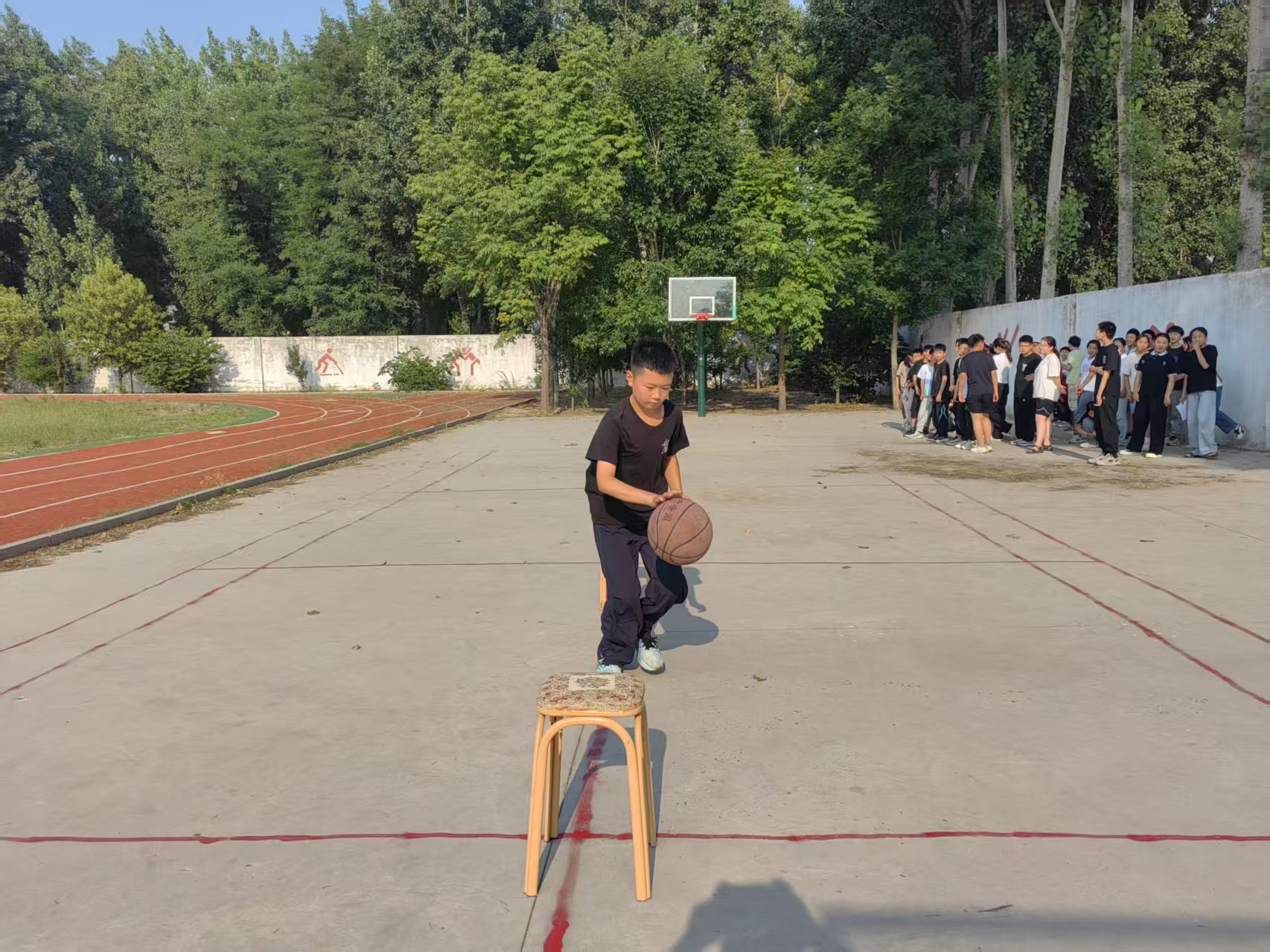 随着一声清脆的哨响,比赛正式拉开帷幕。率先登场的是低年级组的小选手们,他们虽然年纪小,但个个精神抖擞,斗志昂扬。小选手们双手紧紧握着篮球,眼睛紧紧盯着前方的标志桩,像一群勇敢的小战士,向着目标奋勇前进。运球、绕桩、转身、冲刺,每一个动作都充满了童真与活力。高年级组的选手们个个身手矫健,运球技术娴熟。他们在标志桩之间灵活穿梭,篮球在他们的手中就像被施了魔法一样,听话地随着他们的动作上下跳动。各班选手们你追我赶,互不相让,在接力环节,选手们更是争分夺秒,将手中的篮球稳稳地传递给下一位队友。每一次成功的交接,都凝聚着团队的信任与默契;每一次冲刺,都展现着同学们对胜利的渴望。