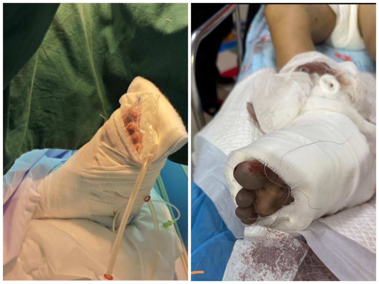 在手术室内,周继娟医生带领着医疗团队,正与时间展开一场激烈的赛跑。右脚严重变形,肿胀发黑,多处伤口出血,皮肤冰凉,还伴有张力性水泡,肢端没有知觉。但周医生没有丝毫退缩,凭借着精湛的医术和丰富的经验,彻底清创探查,发现血管断裂、组织挫烂严重,遂进行骨折内固定、血管移植、神经、肌腱、关节囊修复等手术,过程漫长而艰难,医生们全神贯注,一刻也不敢松懈。7个小时后,右脚逐渐红润起来,周医生长长的舒了一口气,疲倦的脸庞充满了成功的喜悦。