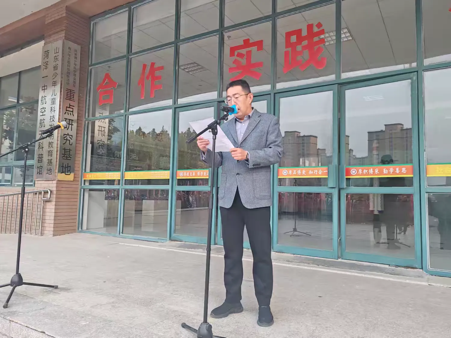 菏泽一中南京路校区副校长王锋轩老师发表了热情洋溢的讲话。他首先代表学校,向为本届科技节辛勤付出的全体教职员工表示衷心的感谢,向在各项活动中取得优异成绩和积极参与的同学们致以热烈的祝贺与诚挚的问候。
