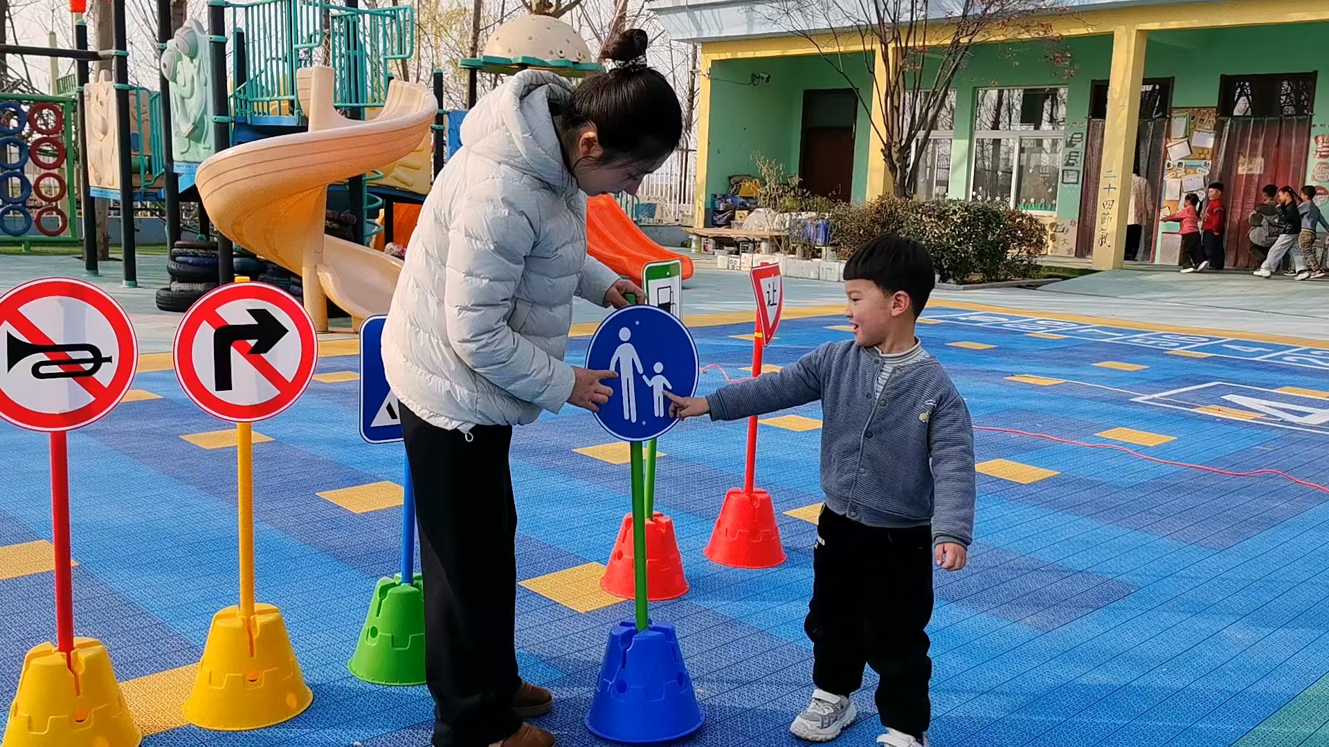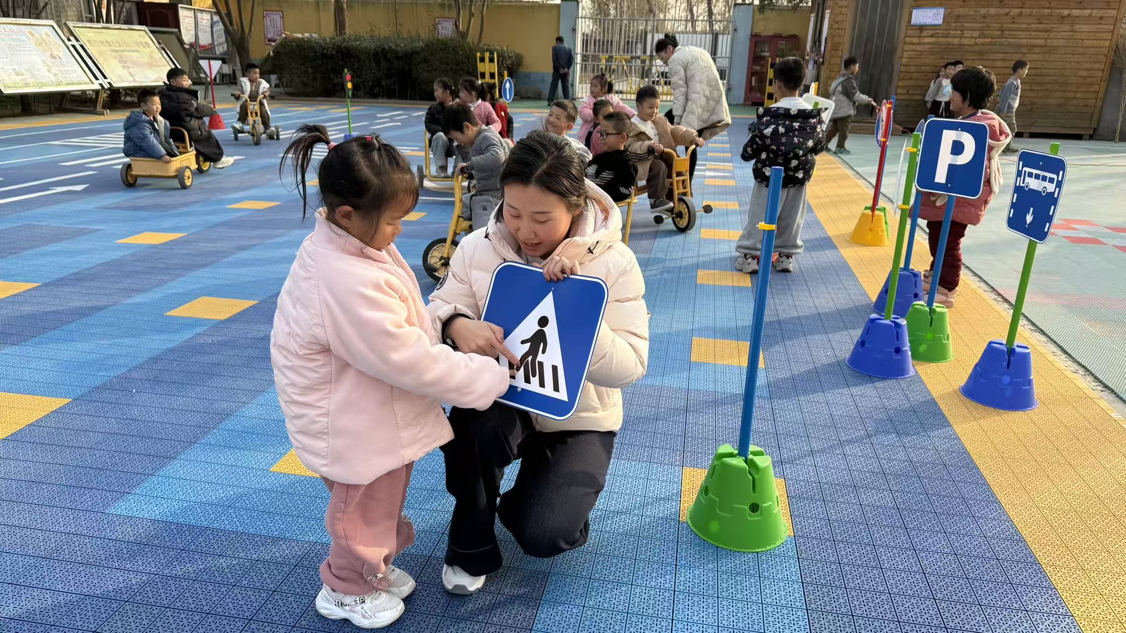 活动中,老师通过趣味课件讲解红绿灯、斑马线、禁止逆行等常见交通标识,用情景模拟让幼儿直观理解标识含义。骑行体验环节,孩子们骑着玩具车,严格遵守“红灯停、绿灯行”规则,避开“危险区域”,有序通行“斑马线”,全程自主遵守交通规范。期间,孩子们发现同伴骑行压线,还会主动提醒“要走规定路线,不然会有危险”,展现出良好的安全认知。