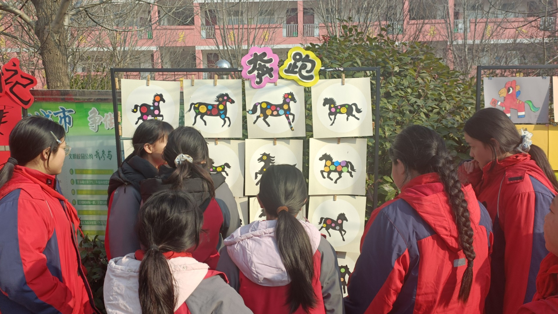 本次展览内容丰富、形式多样,共设置多个特色主题展板,各具亮点。“奔跑吧小马”主题展板上,一幅幅形态各异的奔马画作跃然纸上,矫健的身姿、灵动的笔触,既展现出同学们的绘画功底,更象征着朝气蓬勃、奋勇向前的少年风貌;“马字演变”系列作品,清晰呈现从甲骨文到现代汉字的发展脉络,让学生直观感受汉字文化魅力;鱼、福字、柿子等主题画作,寄托“年年有余”“事事如意”的美好祈愿,尽显传统民俗韵味;“温暖毛衣”主题展板,藏着学生们天马行空的创意,满是童真童趣,为全校师生呈现了一场充满童真与艺术气息的视觉盛宴。