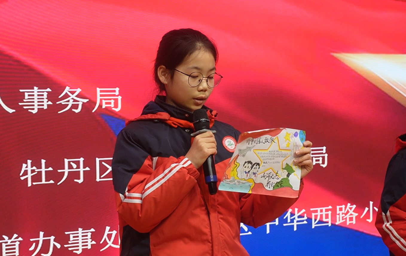 1月13日,由菏泽市退役军人事务局主办,牡丹区退役军人事务局、牡丹区西城街道办事处协办的“情系边海防官兵 童心绘就爱国情”致敬军人主题活动在中华西路小学顺利举行。菏泽市退役军人事务局、牡丹区人武部、牡丹区退役军人事务局、牡丹区西城街道党工委等部门相关负责同志出席本次活动,进一步弘扬“军爱民、民拥军”的优良传统,推动辖区双拥工作走深走实。