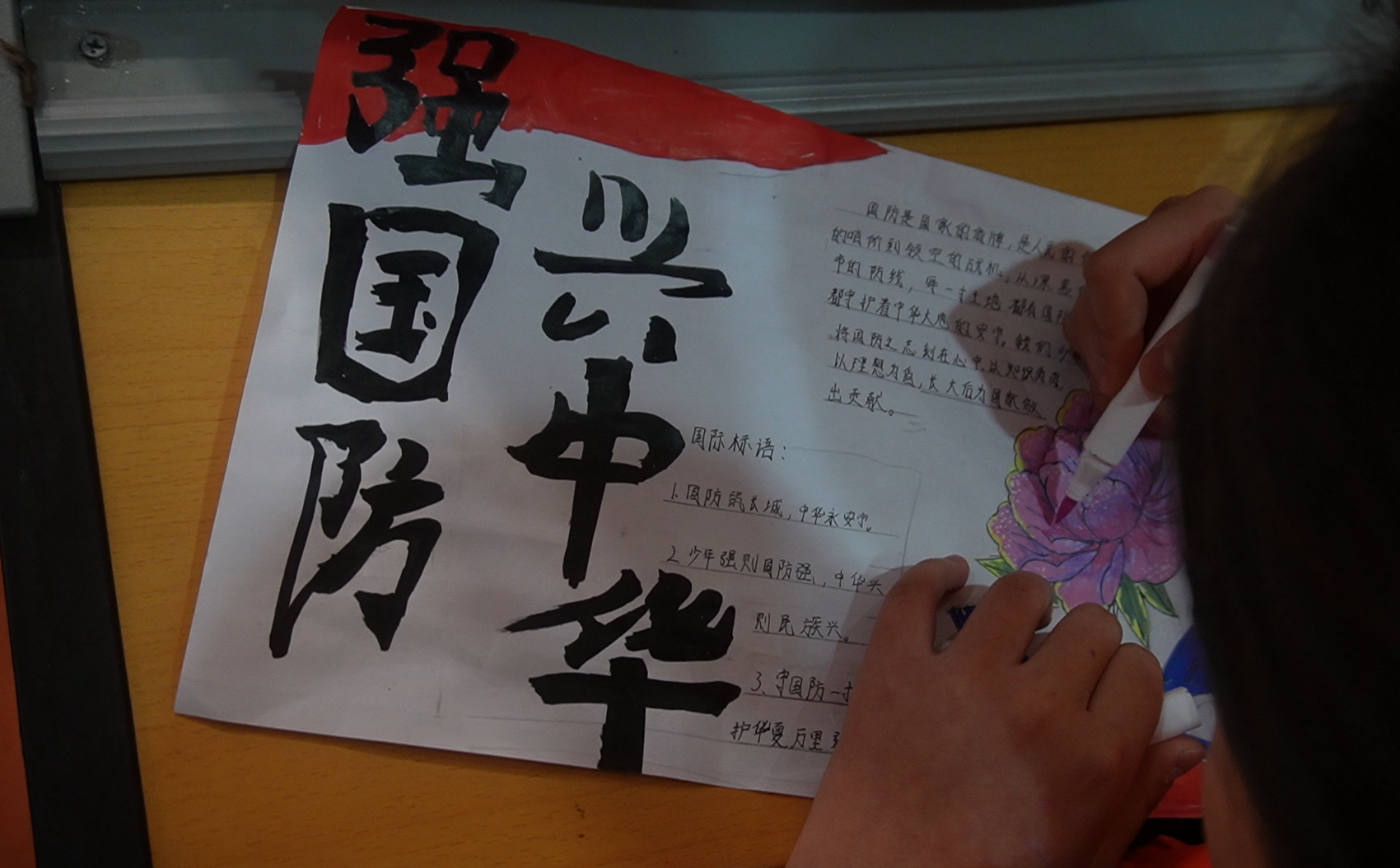 活动按照既定议程有序推进。现场创作环节,同学们拿起画笔、铺开画纸,以“致敬边海防官兵”为主题尽情创作,学校老师、参会领导一同在现场巡回指导,不时与同学们交流创作思路,引导大家更深刻地理解军人的责任与担当。鲜艳的五星红旗、挺拔的军人身姿、辽阔的边海防疆土……一个个边防元素在笔尖流转,一幅幅充满童真与深情的手抄报逐渐成型,每一笔都饱含着对官兵的祝福,彰显着浓厚的爱国情怀。创作完成后,学生代表依次上台展示作品,讲述自己的创作理念。