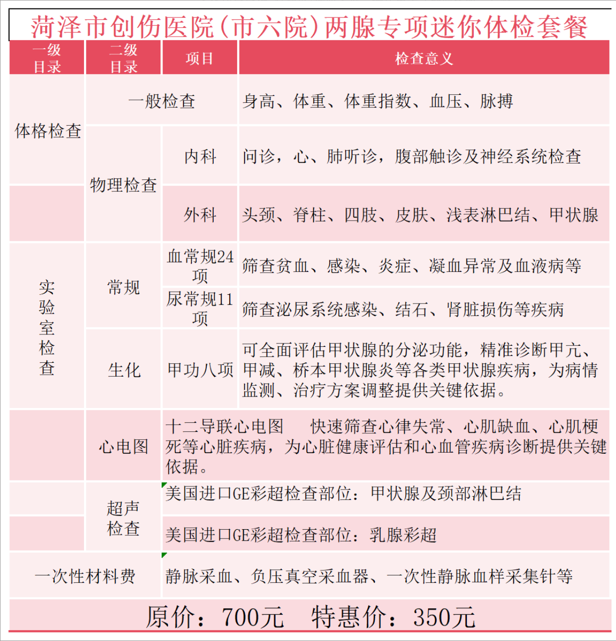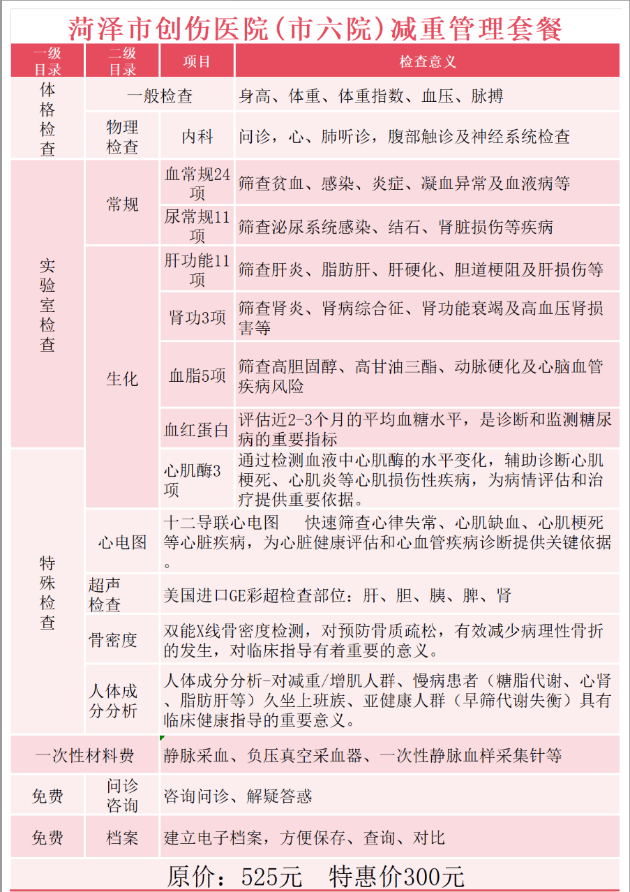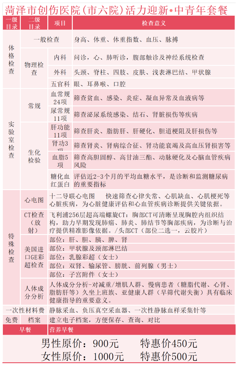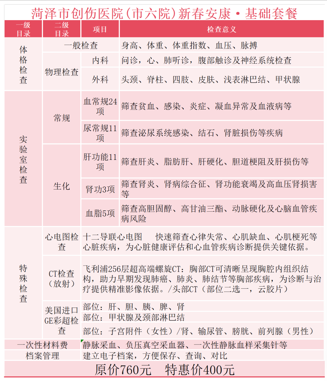 值此辞旧迎新之际,菏泽市创伤医院(市六院)健康管理部推出2026新春体检套餐,以专业的医疗保障、贴心的服务体验,为您和家人的健康保驾护航。
