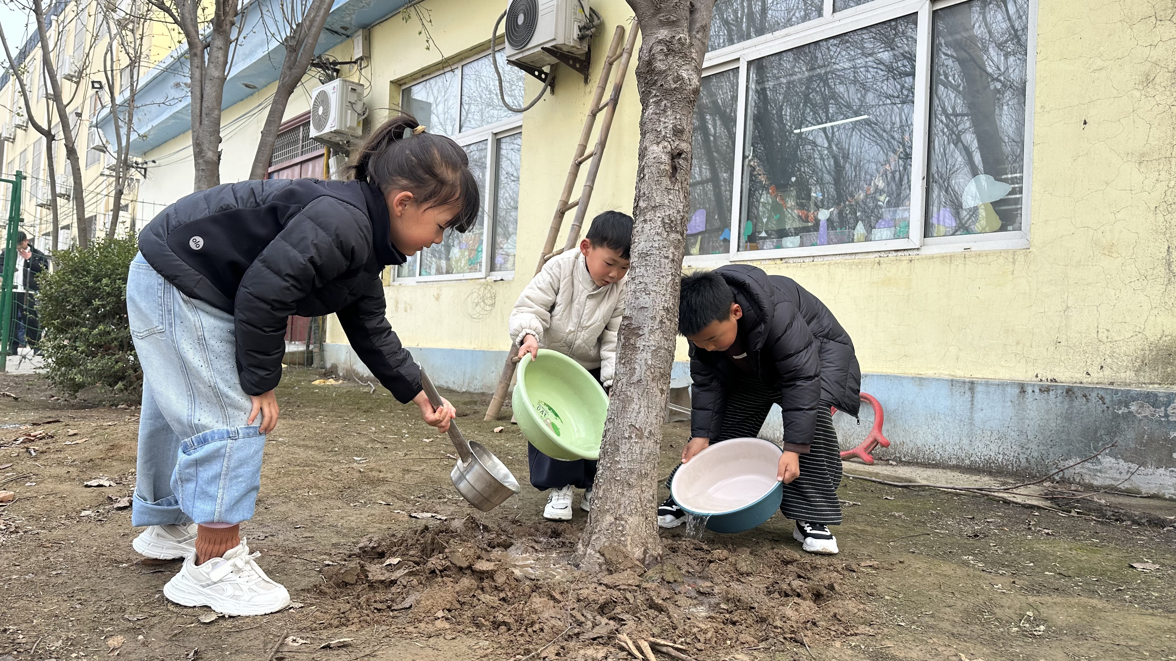 活动伊始,各班开展植树节畅谈会,结合科普绘本讲解节日由来,孩子们分享心中的植树节,种下爱绿护绿的种子。同时,幼儿园发起“我的绿植朋友”计划,孩子们从家中带来盆栽,开启专属绿植领养之旅,还为绿植制作标识贴,在日常照料中感受生命成长。园内户外场地成了孩子们的自然课堂,趣味十足的护绿实践活动轮番开展。孩子们手持工具,在老师的指导下学习松土、浇水的正确方法,为班级自然角和园区绿化带的绿植、小树细心浇灌,大班幼儿还分组为大树松土、清理周边杂物,中班、大班孩子则开展树皮拓印活动,将树皮纹理拓印在画纸上,结合创意绘画制作专属作品,在触摸、创作中感受自然之美。