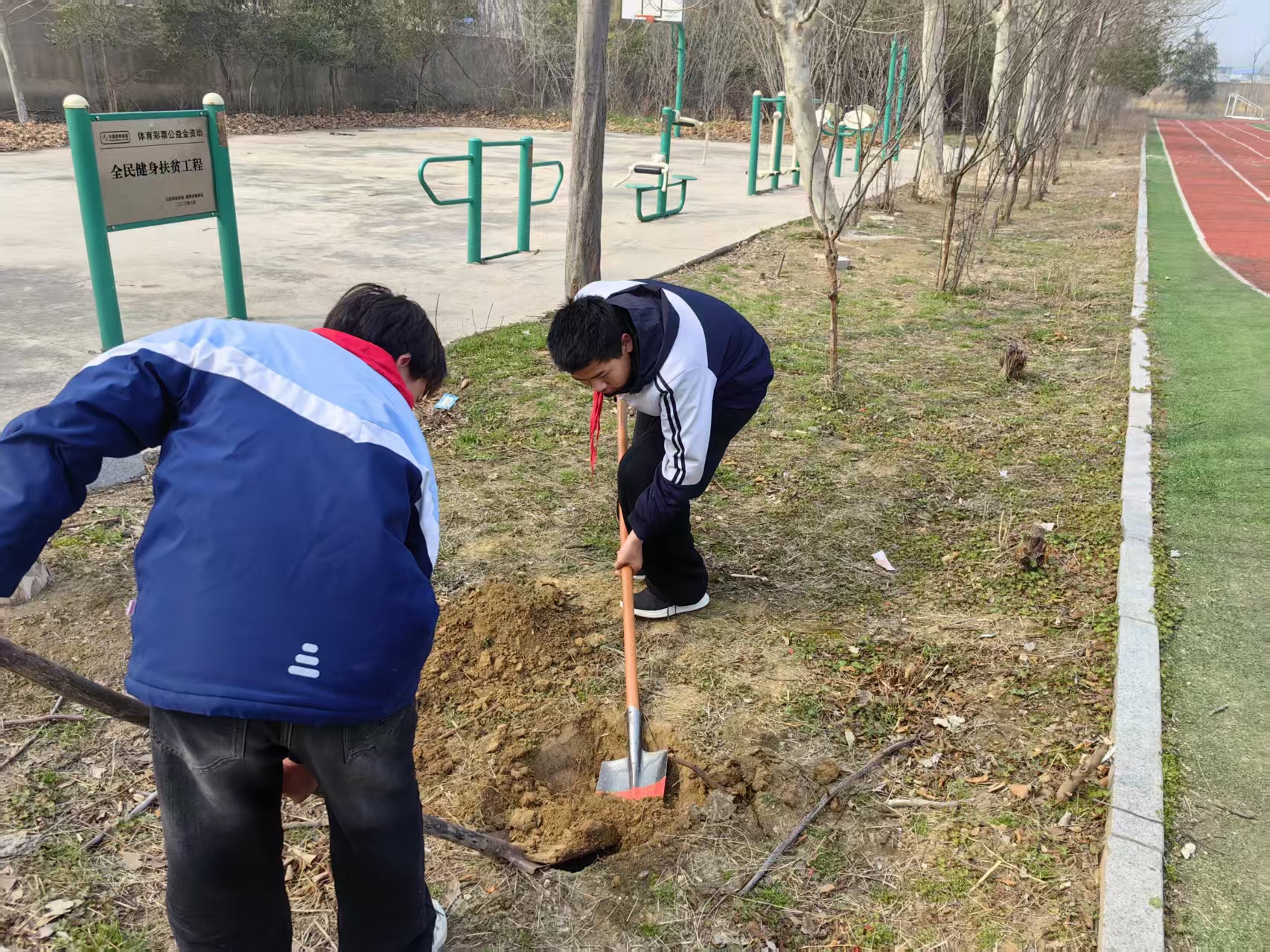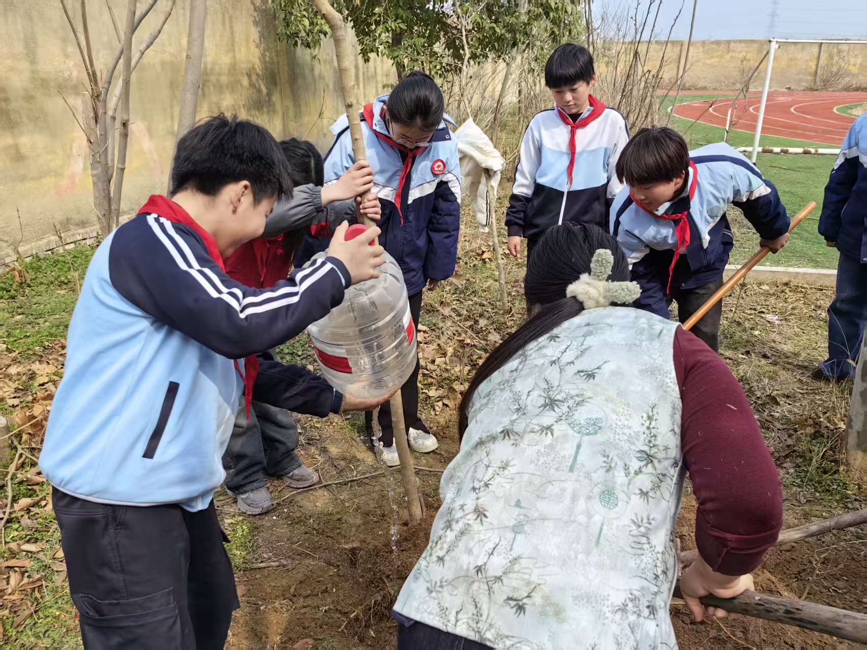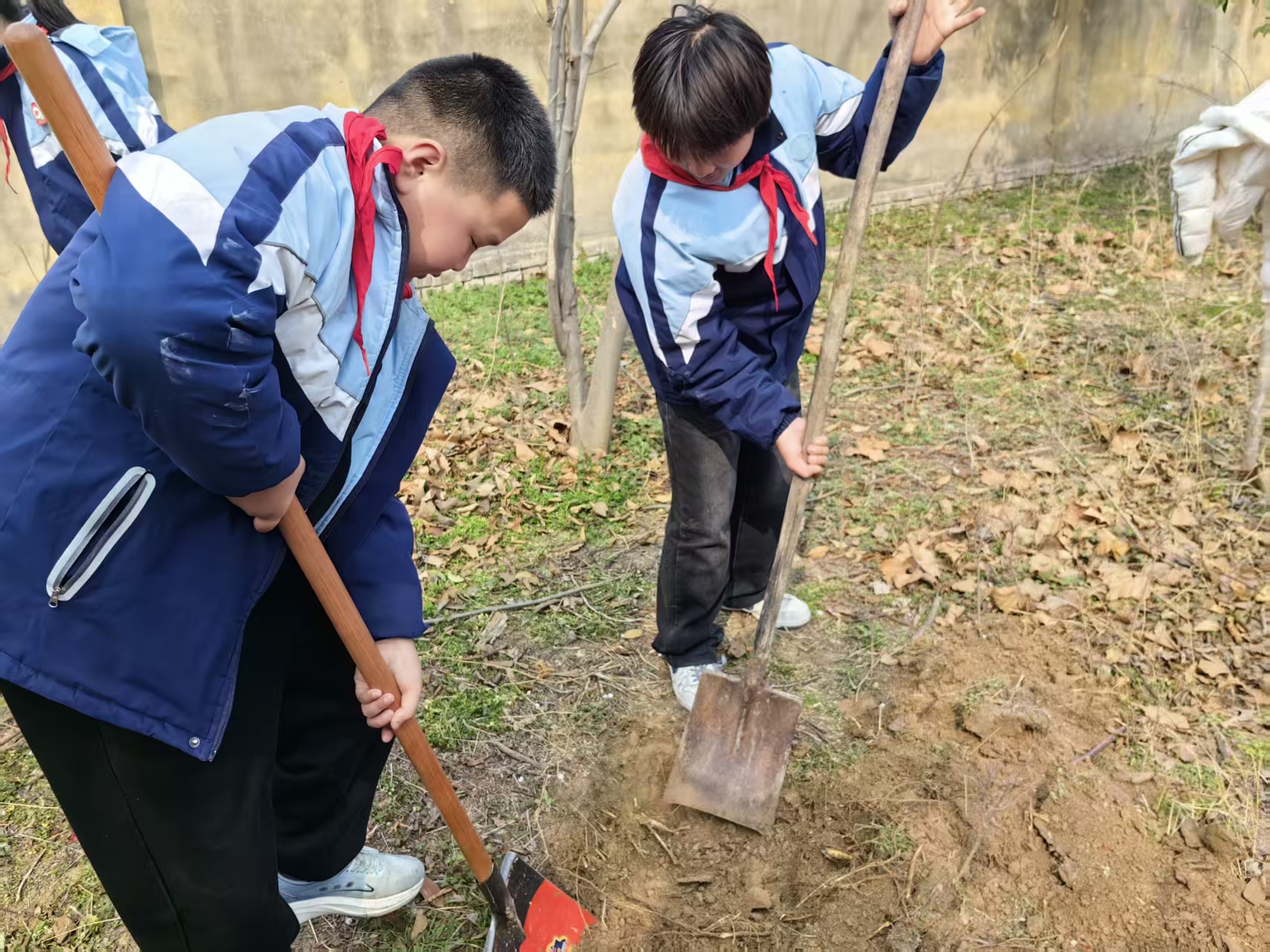 活动当天,同学们在老师的带领下,手持铁锹、水桶等工具,精神饱满地来到植树场地。大家分工明确、团结协作,挖坑、扶苗、填土、浇水,每一个环节都做得认真又规范。同学们干劲十足,不怕脏、不怕累,亲手将一棵棵小树苗栽入土中,用汗水浇灌绿色希望。