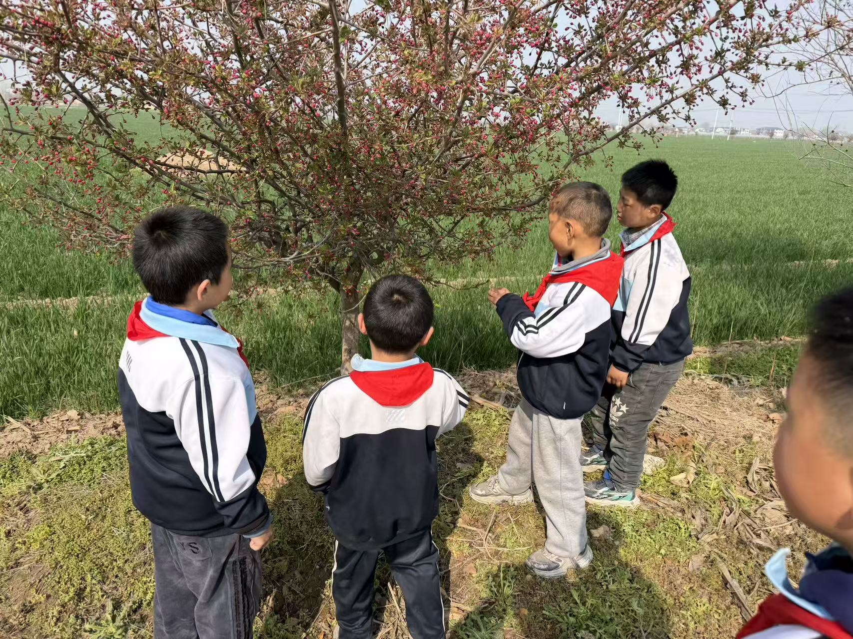 抵达田野后,孩子们在老师的引导下,近距离观察春日里的麦田、抽芽的树木与含苞待放的花枝,认识不同的植物,感受泥土的气息。老师们也全程陪伴在侧,一边讲解春日物候知识,一边叮嘱安全注意事项,让孩子们在玩乐中学习,在探索中成长。