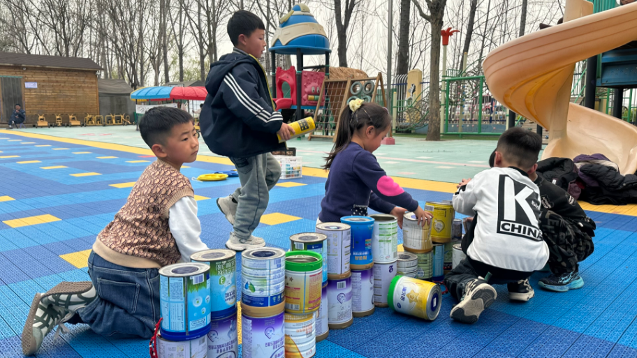 活动开始前,教师引导幼儿利用易拉罐、奶粉桶等废旧材料,分组搭建专属“防御城墙”,并讨论分工与游戏规则。游戏中,幼儿们迅速进入角色:前方幼儿手持软垫作为“盾牌”,专注防守、保护己方城墙;后方幼儿则化身“小投手”,瞄准对方城墙精准投掷沙包,攻防之间充满紧张与趣味。大家默契配合,时而调整防守姿势,时而变换进攻策略,在欢声笑语中尽情释放活力。教师在旁细心观察,适时给予鼓励与安全指导,确保游戏有序开展。