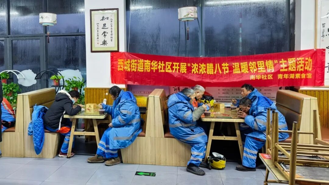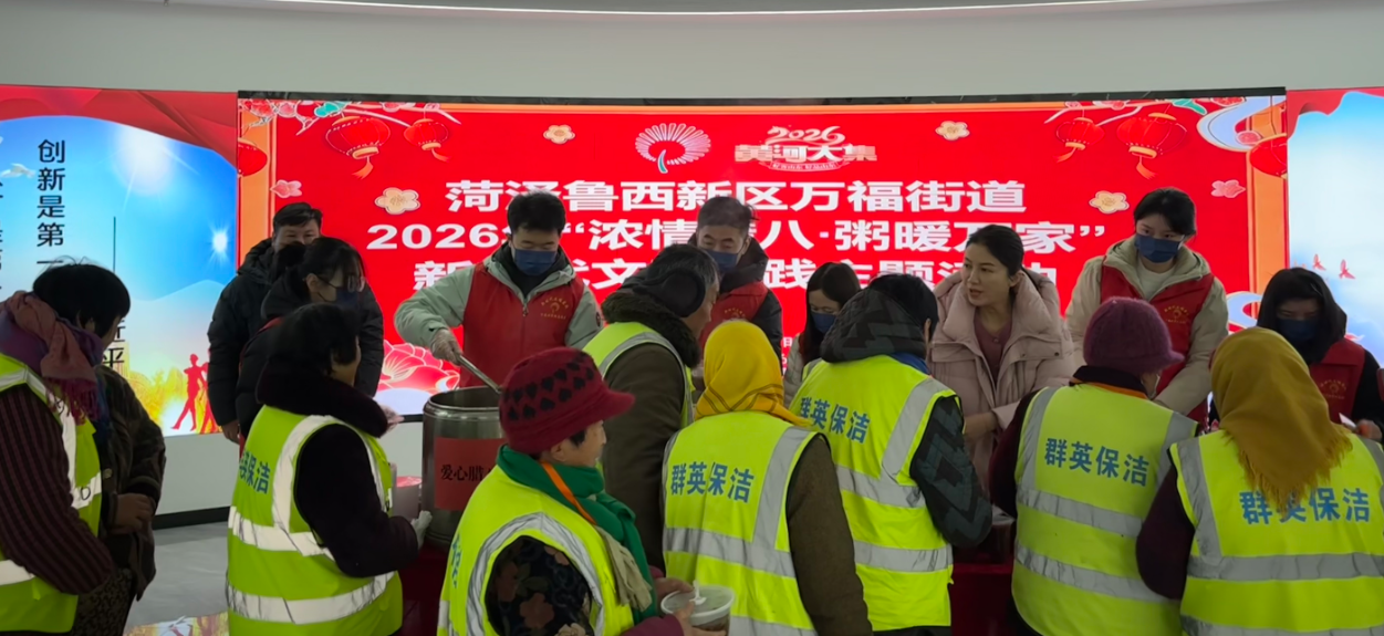 山东商报·山海新闻 李冬访腊八至,寒冬暖。1月26日,菏泽鲁西新区万福街道党群服务中心内粥香四溢、红联映福。万福街道办事处组织开展的