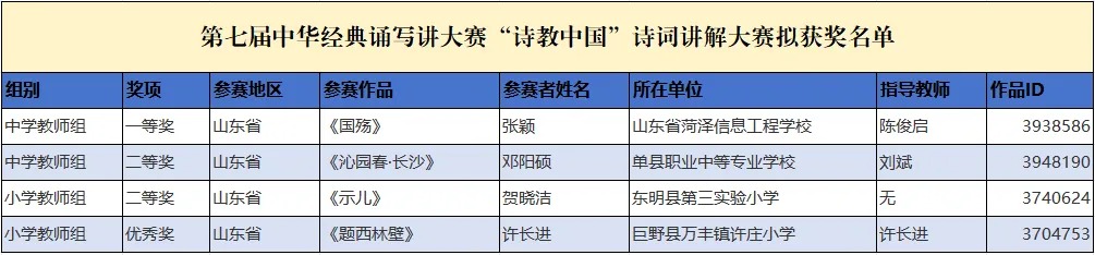 据悉,该赛事为教育部、国家语委主办的全国性赛事,本届“诗教中国”诗词讲解大赛全国有15万人报名、参与测评,最终提交作品3万余件。历经全国初赛、复赛、半决赛、总决赛层层选拔,张颖作为山东省中学教师组代表受邀参加在北京师范大学(珠海校区)举办的线下总决赛,并荣获全国一等奖。单县职业中等专业学校教师邓阳硕获中学教师组二等奖,东明县第三实验小学教师贺晓洁获小学教师组二等奖,巨野县万丰镇许庄小学教师许长进获小学教师组优秀奖。充分展现了我市青年教师的文学素养与教学风采。