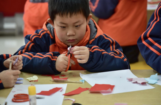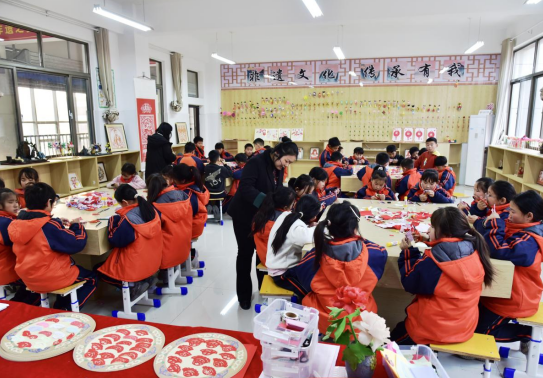 剪纸教室内,曹州剪纸代表性传承人吴金燕一边讲解冬至吃饺子的民俗渊源,一边手把手传授折纸、运剪技巧。孩子们凝神聚力,小心翼翼裁剪,一张张红纸很快变身为精致玲珑的水饺剪纸。同学们还为剪纸搭配手绘碗碟,仿佛一盘盘热气腾腾的饺子,氤氲着民俗文化的醇厚气息。