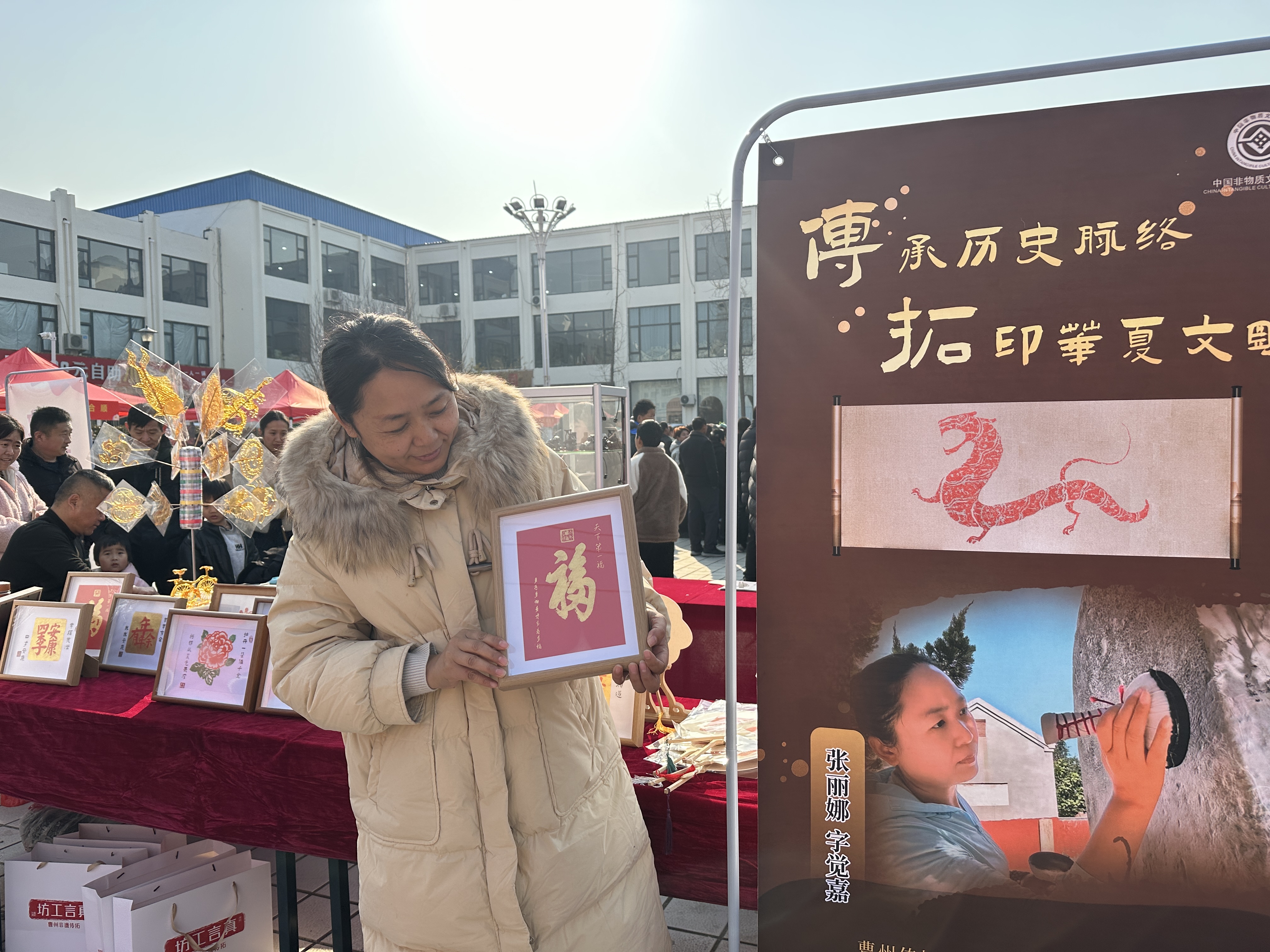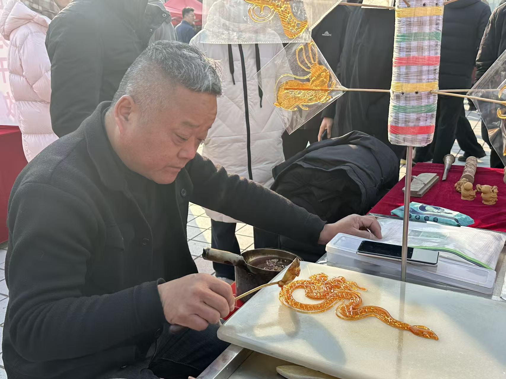 活动现场,非遗展区人气爆棚,成为全场焦点。合香、木雕、糖画、剪纸、花馍、折扇、传拓、面人、木版年画等传统工艺项目各展风采,传承人们现场献艺,一刀一凿、一纸一剪间尽显匠心;孙膑金口诀口耳相传,传递着民间智慧与历史故事;井氏养蜂展现出人与自然和谐共生的别样风情;古琴演奏区琴音悠扬,清越古朴的旋律为现场增添了雅致氛围。众多群众驻足观赏、拍照留念,不少家长带着孩子参与互动体验,亲手调配香料、创作剪纸、塑形花馍,在实践中领略传统技艺的魅力,现场欢声笑语不断,热闹非凡。