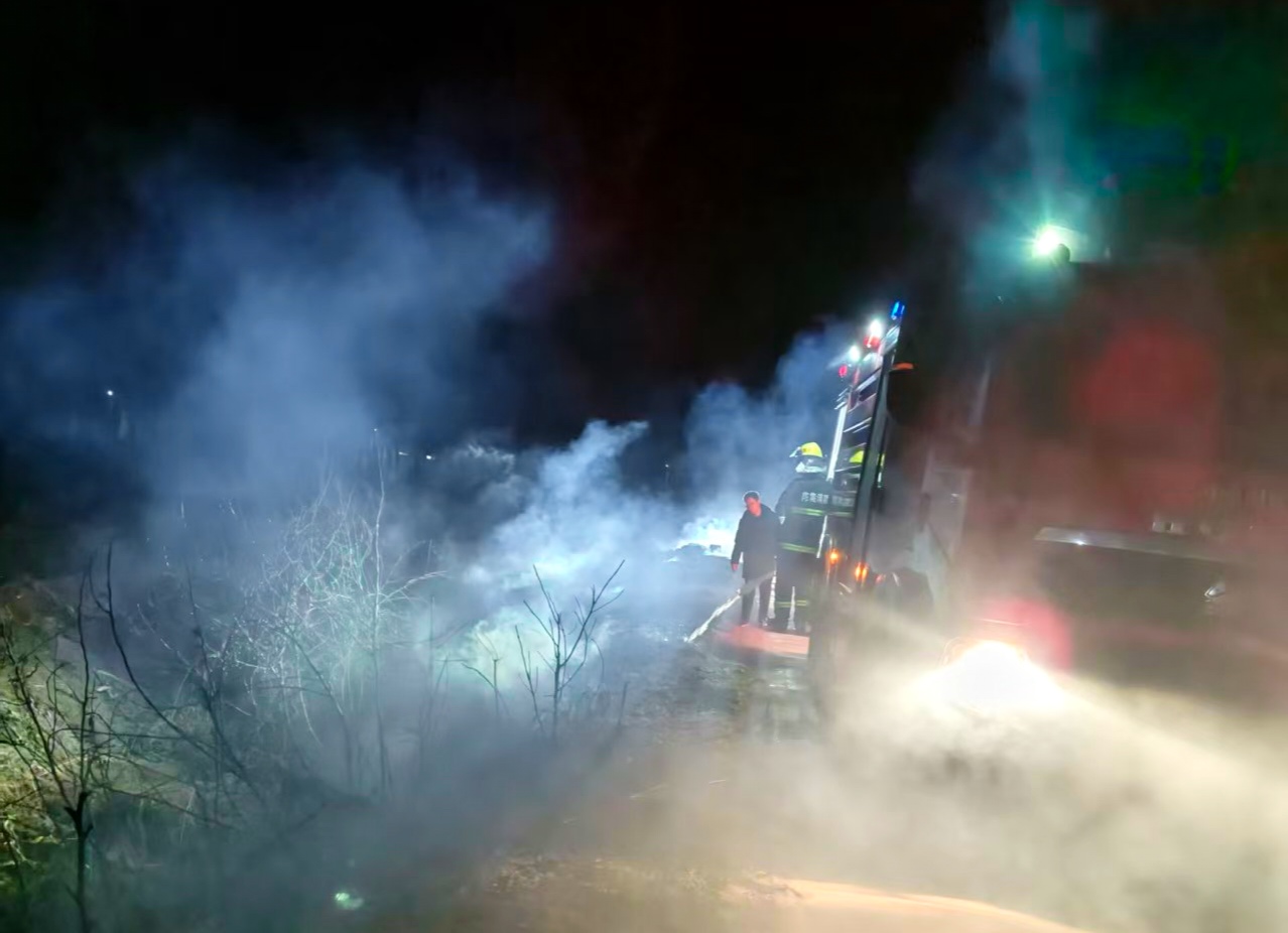 约几分钟后,消防车的警笛声划破了乡村夜晚的宁静。由于报警位置描述精准,消防车几乎未作停留便直达现场。消防员迅速展开扑救,火势很快得到控制。经勘察,起火原因疑似有人遗留火种引燃荒草。由于扑救及时,未波及坑边农户堆放的少量秸秆,避免了农民财产损失。