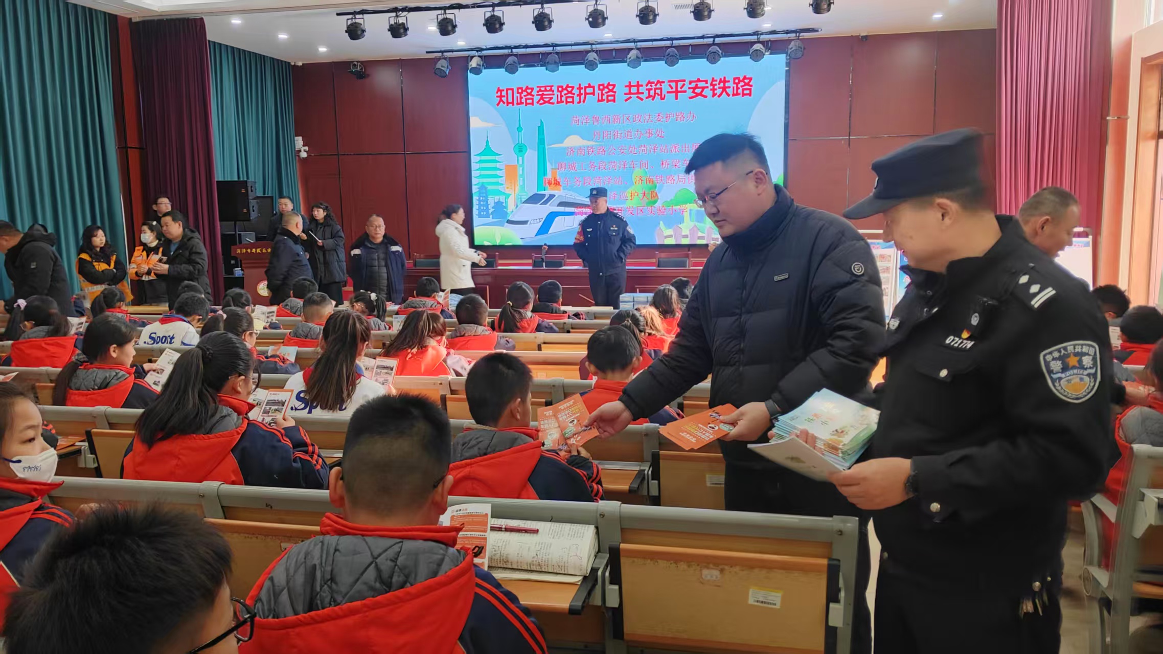 为进一步加强辖区铁路运输安全管理,切实提升沿线中小学生知路、爱路、护路意识与自我防护能力,在寒假来临、学生出行增多的关键节点,2026年1月23日,菏泽鲁西新区丹阳街道联合菏泽鲁西新区政法委护路办、济南铁路公安处菏泽站派出所、聊城工务段菏泽车间及桥梁车间、聊城车务段菏泽站、济南铁路局供电段、菏泽巡护大队等多家单位,走进开发区实验小学开展“知路爱路护路•共筑平安铁路”主题宣传活动。菏泽鲁西新区丹阳街道平安法治办公室副主任苗淑钰、开发区实验小学校长薛平、济南铁路公安处菏泽站派出所执勤警务二队大队长魏巍全程参与活动。