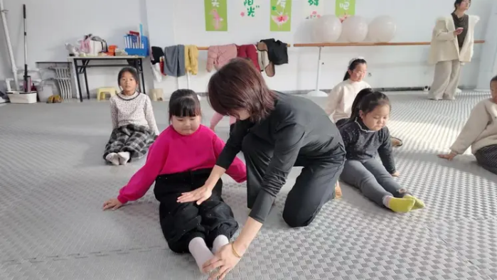 活动现场暖意融融、活力满满。志愿者结合儿童年龄特点与接受能力,量身设计简单易学、活泼欢快的教学内容,兼顾趣味性与实用性。教学伊始,志愿者带领孩子们开展弯腰、压腿、伸展等热身运动,有效规避运动损伤;随后遵循“循序渐进”原则,从站姿、手位、脚步等基础动作切入,逐拍示范、逐人指导,将舞蹈动作拆解细化,让孩子们快速进入学习状态。