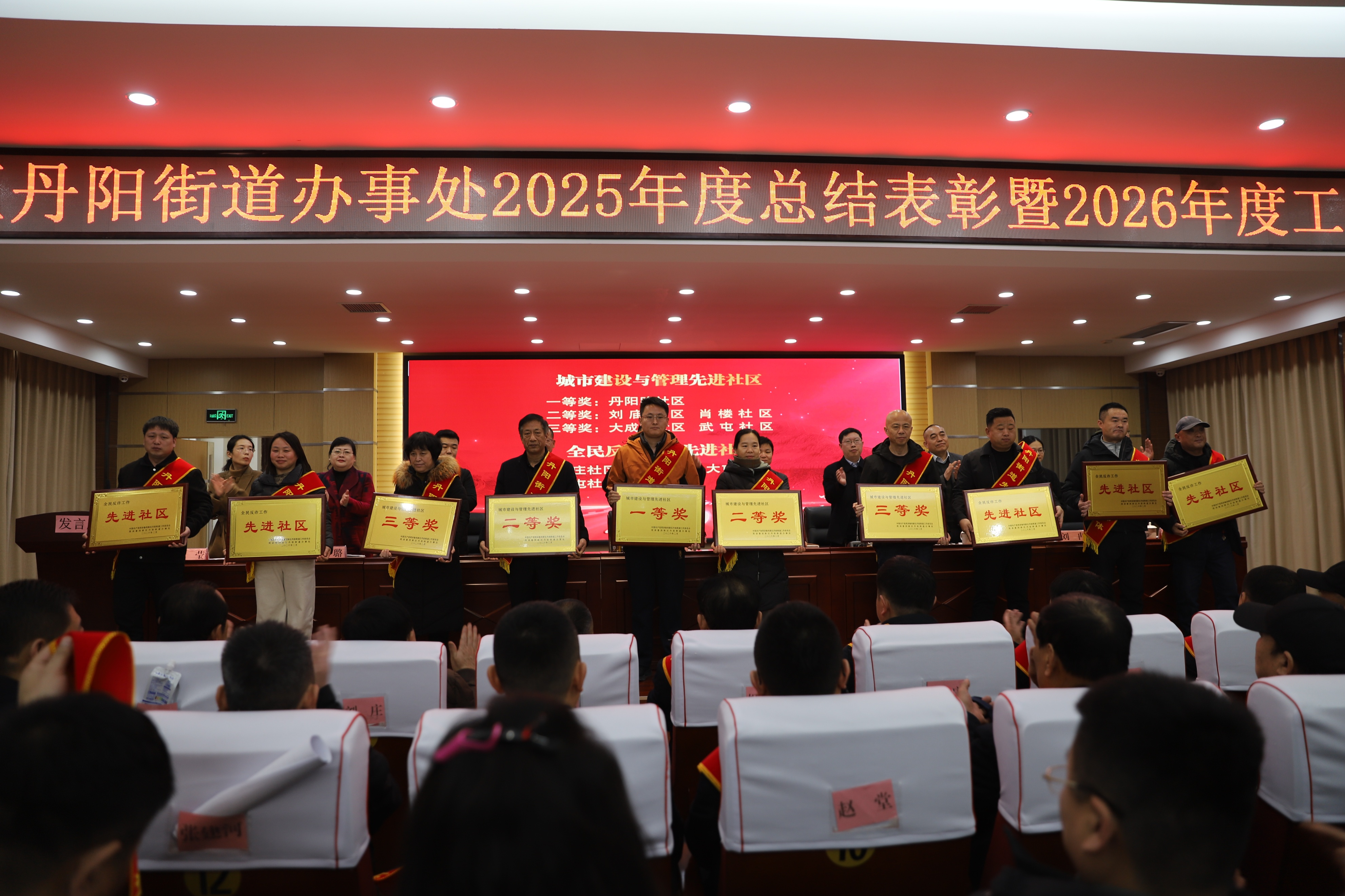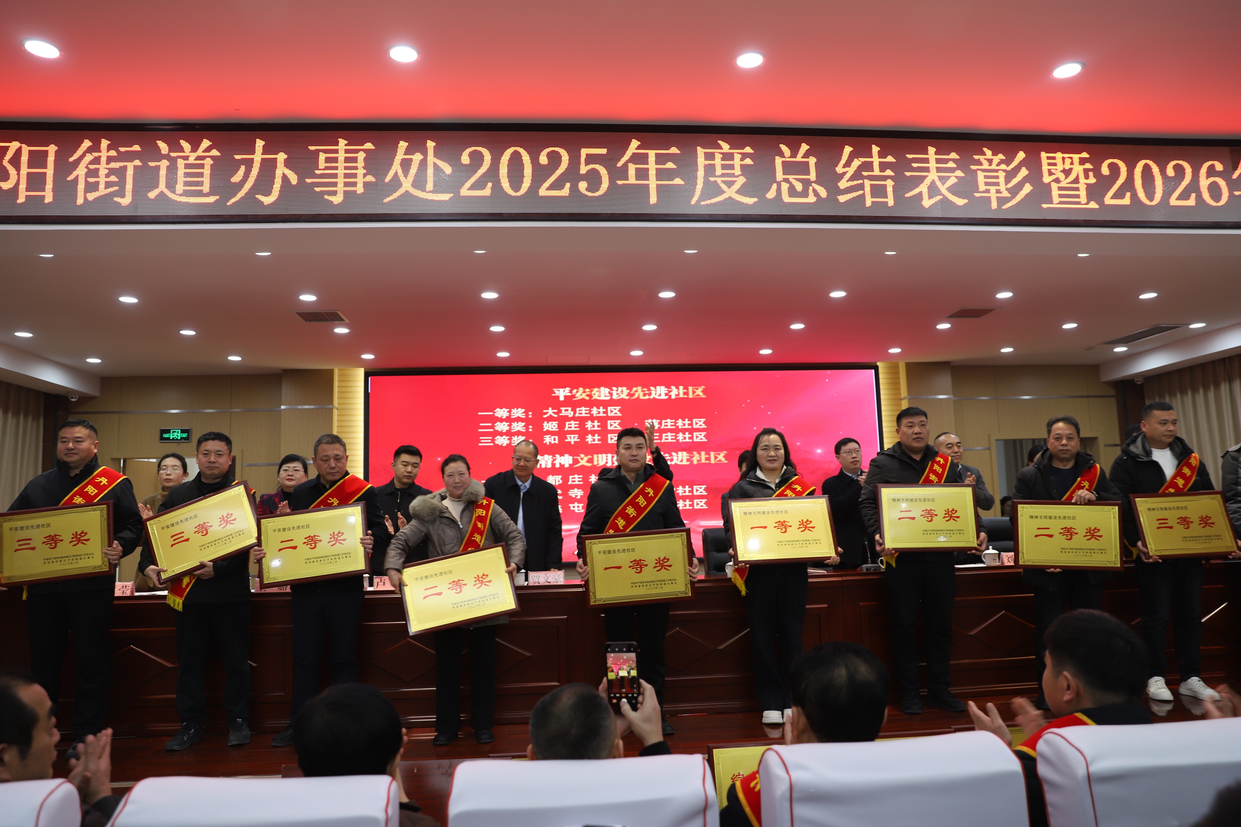 会议在庄严的国歌声中拉开帷幕。街道党工委副书记焦广舟同志宣读《关于表彰二〇二五年度先进集体和先进个人的决定》,与会领导为获奖代表逐一颁奖,现场掌声雷动,气氛热烈。