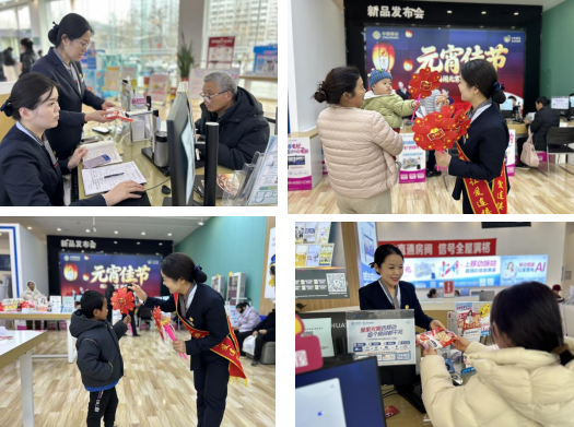 活动现场,工作人员身着整齐制服,以昂扬饱满的精神面貌、亲切热忱的服务态度,迎接每一位到店客户。办理业务的间隙,互动游戏区欢声笑语不断,猜灯谜、趣味闯关等环节妙趣横生;服务台旁,香甜的元宵、精致的灯笼与寓意吉祥的风车依次排开,工作人员将这份份满载祝福的礼品送到客户手中,在一来一往的互动中,悄然拉近了与客户的距离。