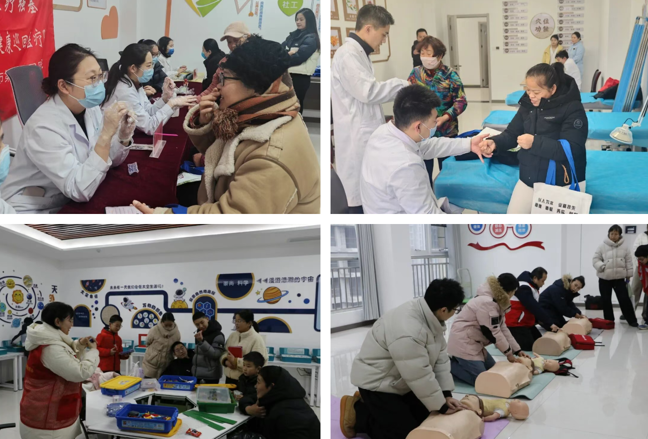 中医理疗义诊、应急救护教学、公益科普小课堂前排起了长队,专家志愿者为居民把脉问诊,普及健康知识。