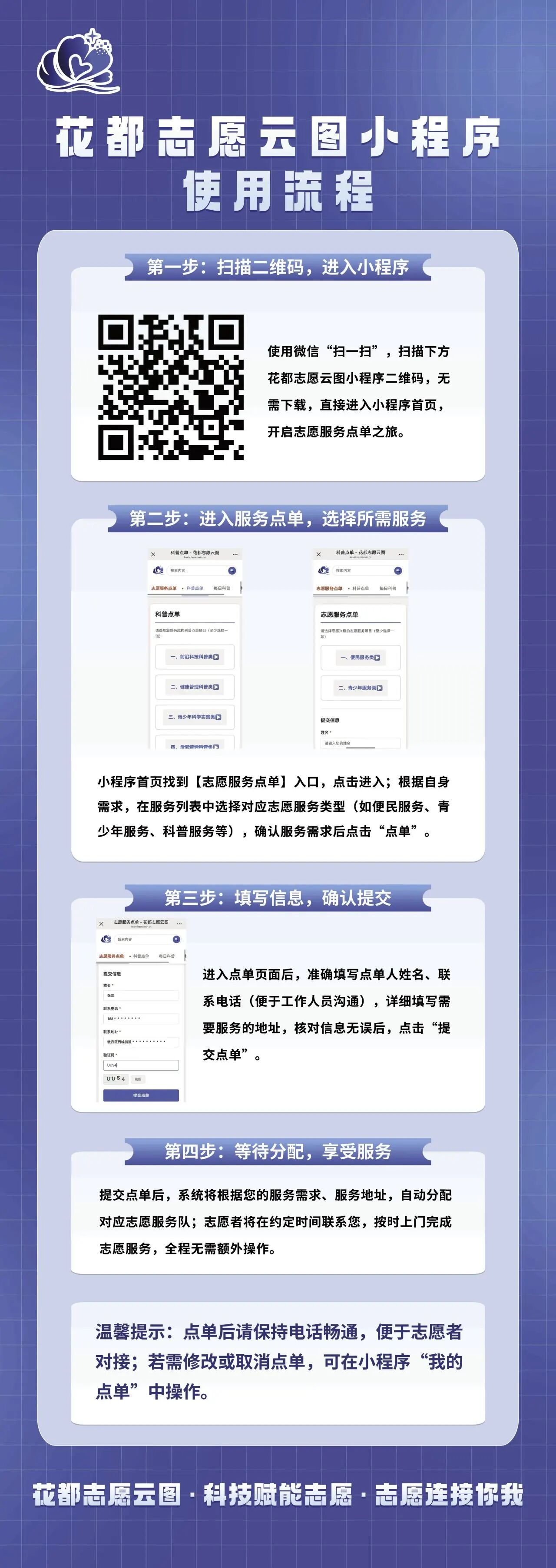 启动仪式上,区科协主席王文义发布了“花都志愿云图”小程序,居民只需扫码,即可像“点外卖”一样预约各类志愿服务,实现“群众点单、社区派单、志愿接单”的精准对接,以数字化手段推动志愿服务提质增效。