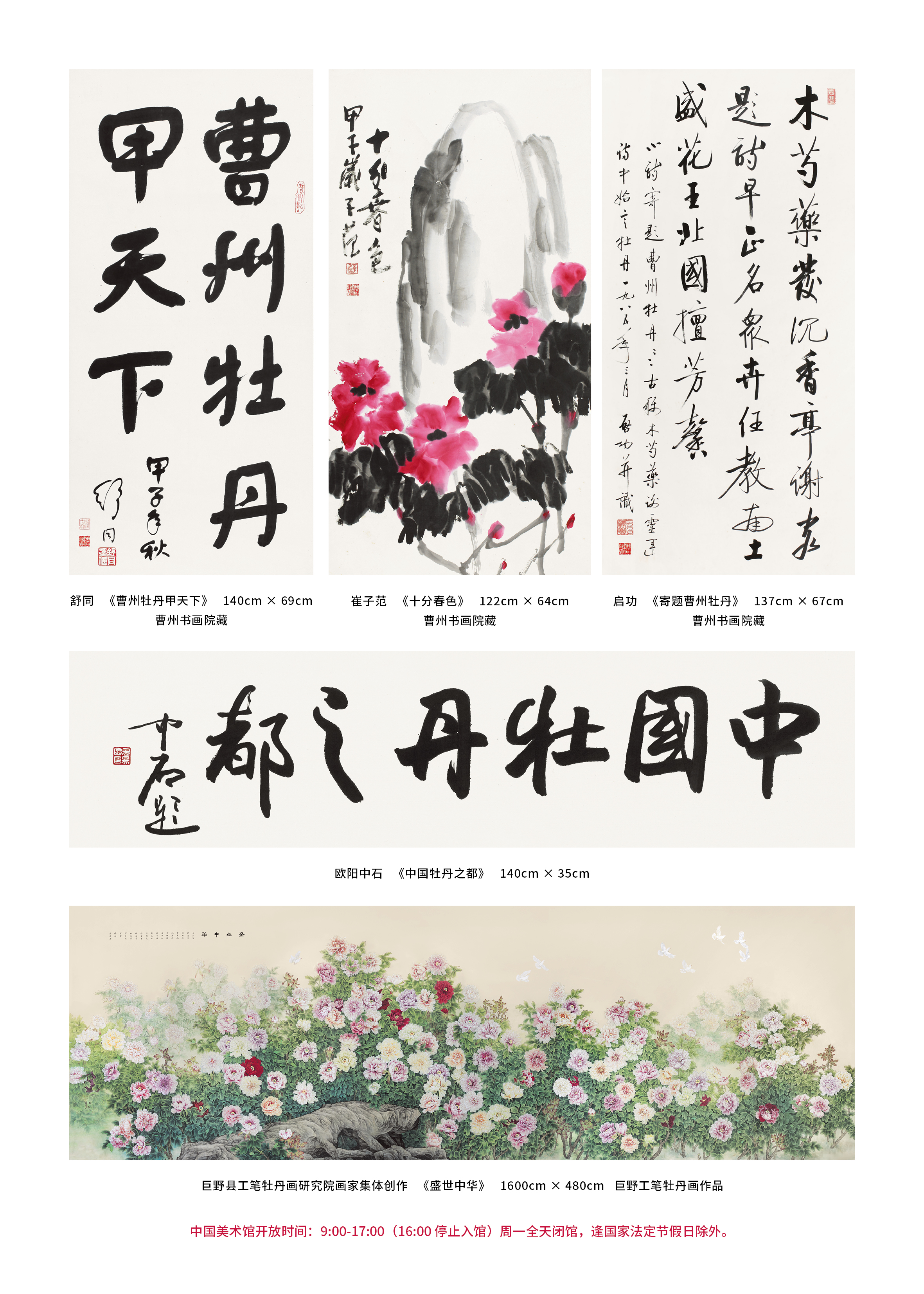 本次展览坚持高标准策划、高水平组织,作品来源广泛、内容厚重:涵盖中国美术馆馆藏精品、曹州书画院院藏作品;汇集菏泽籍当代艺术家代表作,以及“花开盛世”中国牡丹之都(菏泽)牡丹主题书画大展、“乡风墨韵”全国中国画作品展获奖及优秀作品;集中呈现巨野工笔牡丹画创作成果,全方位展现菏泽书画艺术魅力。