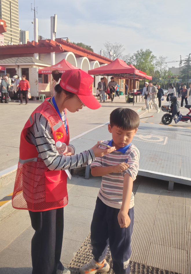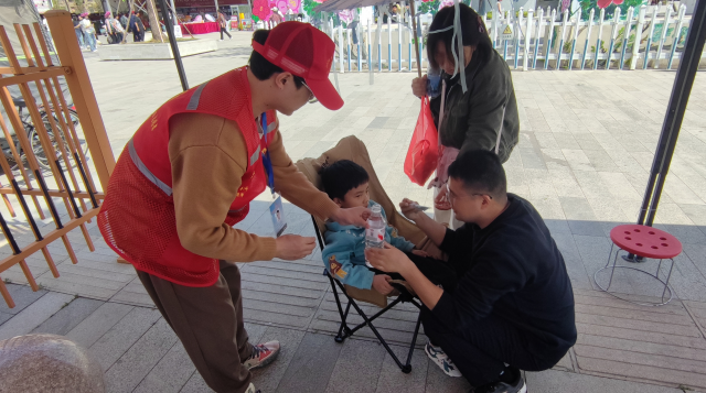在园区外,一名小朋友在游玩中不幸受伤,伤口的疼痛令他十分委屈。为安抚孩童的情绪,志愿者将他带到搭建的临时帐篷下,为其提供舒适的躺椅,并拿出预备好的矿泉水和消毒药品,帮助孩子消菌杀毒,缓解情绪。在志愿者的努力下,孩子伤口得到有效处置,情绪亦得以恢复。得到充足的休息后,孩子在家长的陪伴下继续向园区内走去。
